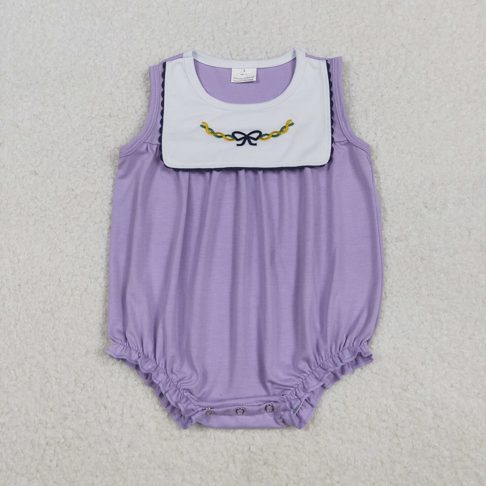Girls Infant Sleeveless Embroidery Mardi Gras Bow Purple Bubble Romper RTS