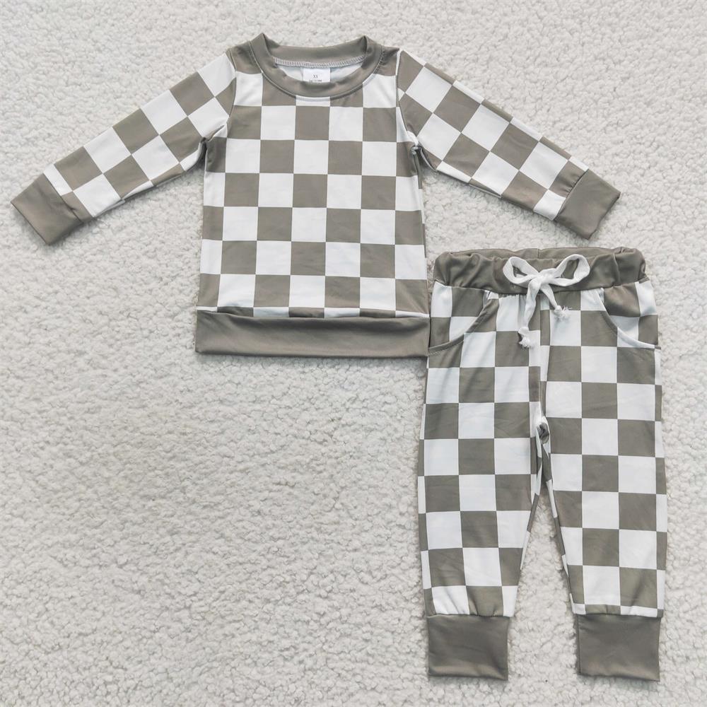Promotion Baby Boy Kids Long Sleeves Shirt Pocket Pants Green Checked Outfit
