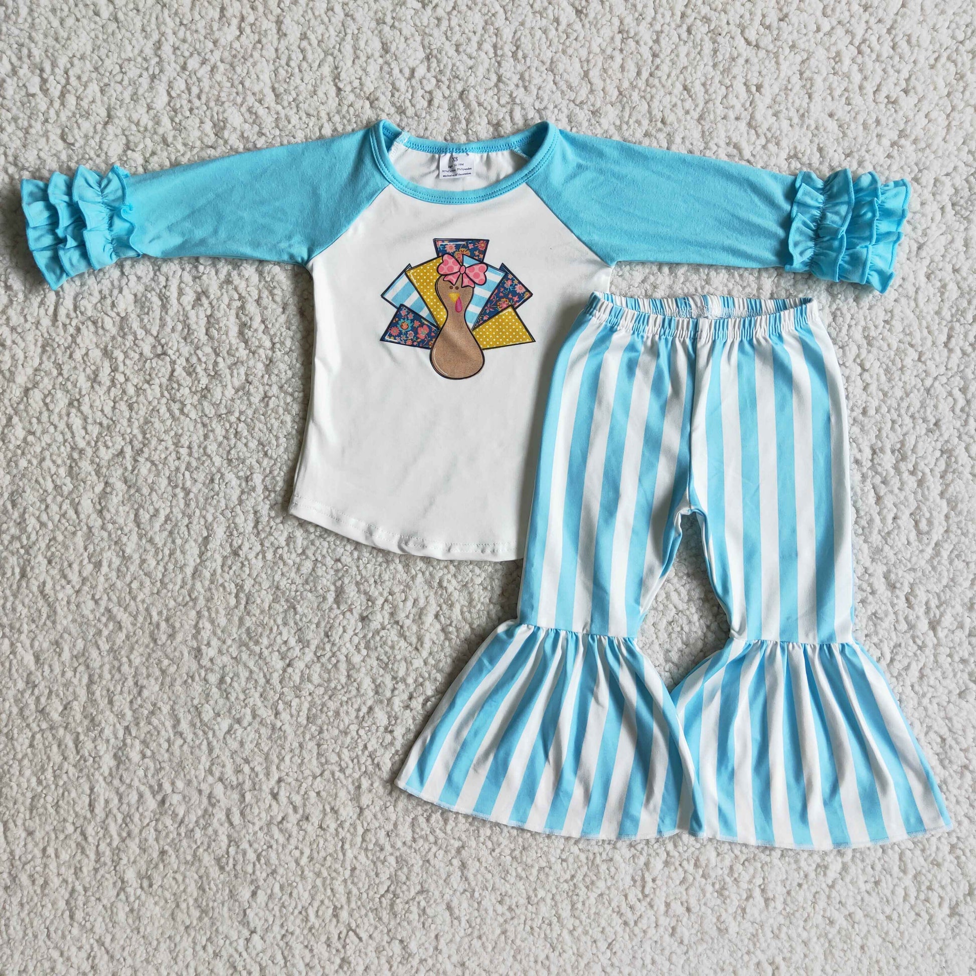 Promotion Baby Girl Long Sleeves turkey Blue Stripes Bell Pants Thanksgiving Set RTS