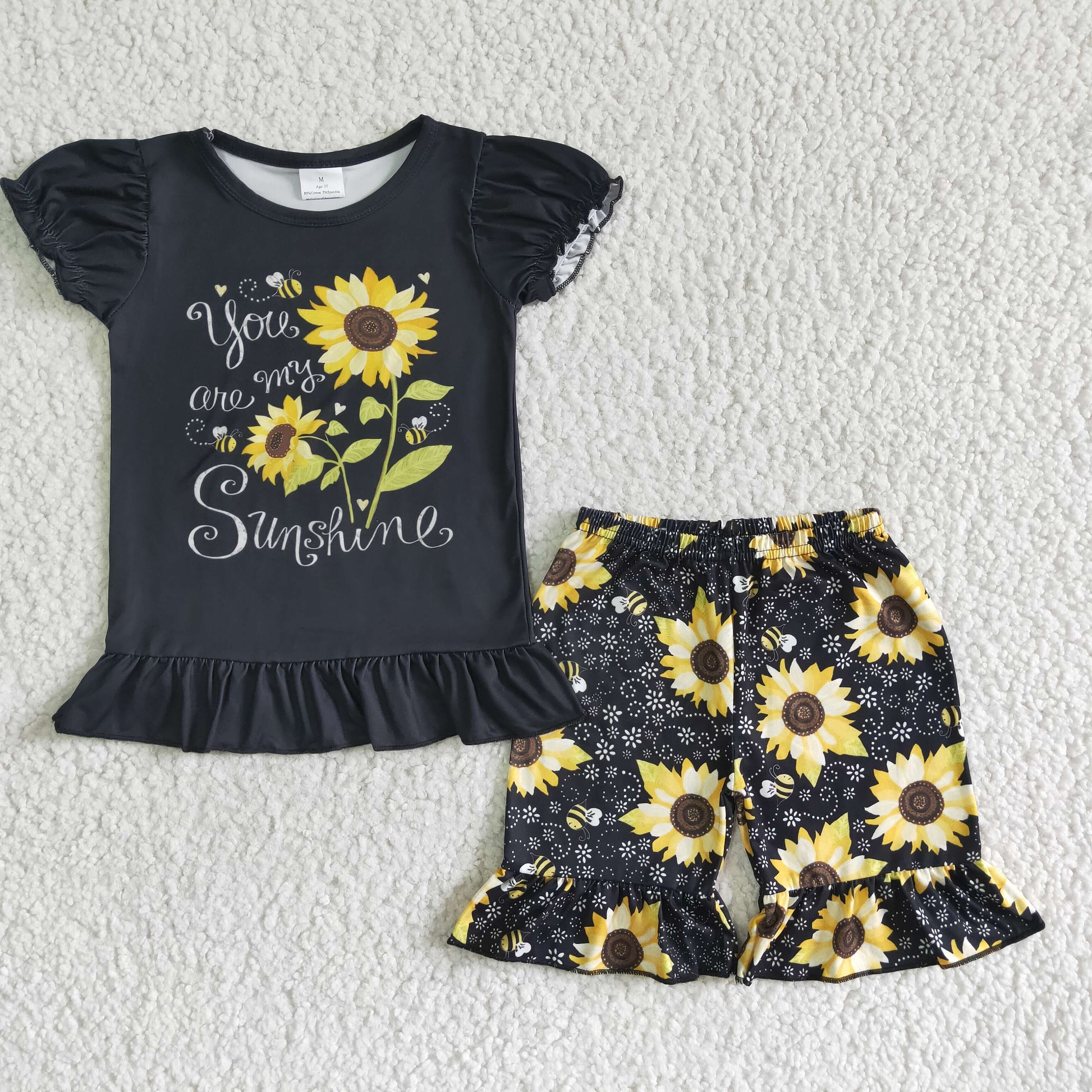 Promotion Baby Girl Summer Short Sleeves Black Shirt Flower Shorts Set RTS