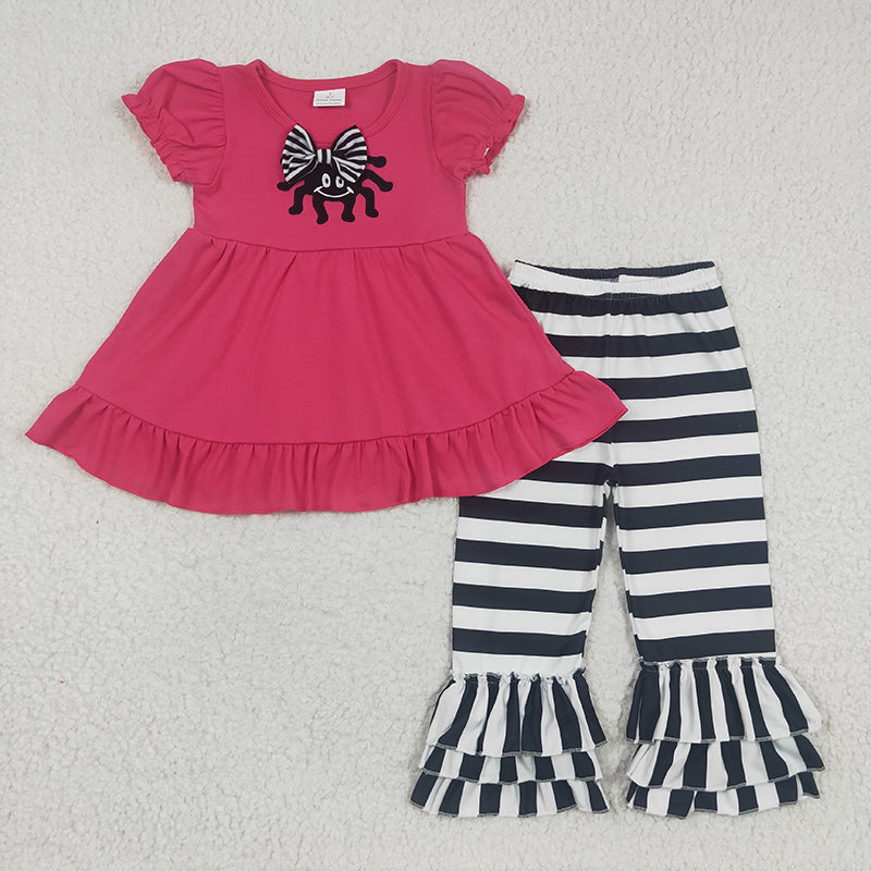 Promotion C2-8-1 Baby Girl Short Sleeves Embroidery Spider Tunic Striped Ruffle Pants Outfit
