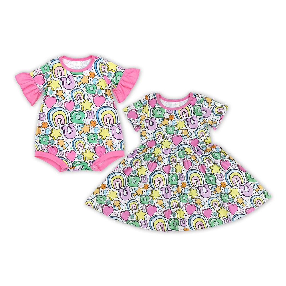 Baby Girl Short Sleeves St. Patrick's Rainbow Hearts Sibling Sister Romper Dress Clothes