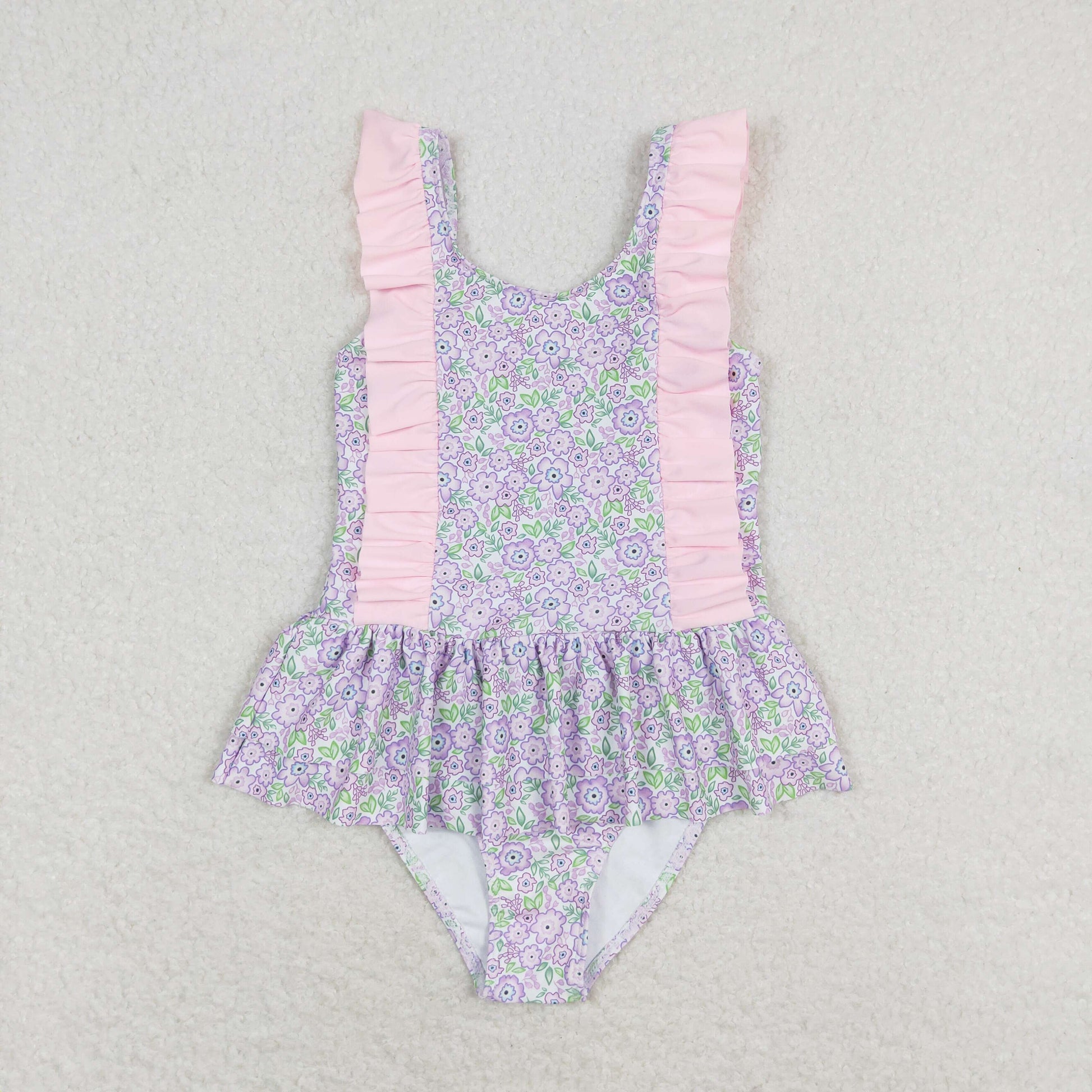 Baby Girl Ruffle Sleeves Floral Purple One-piece Swimsuit