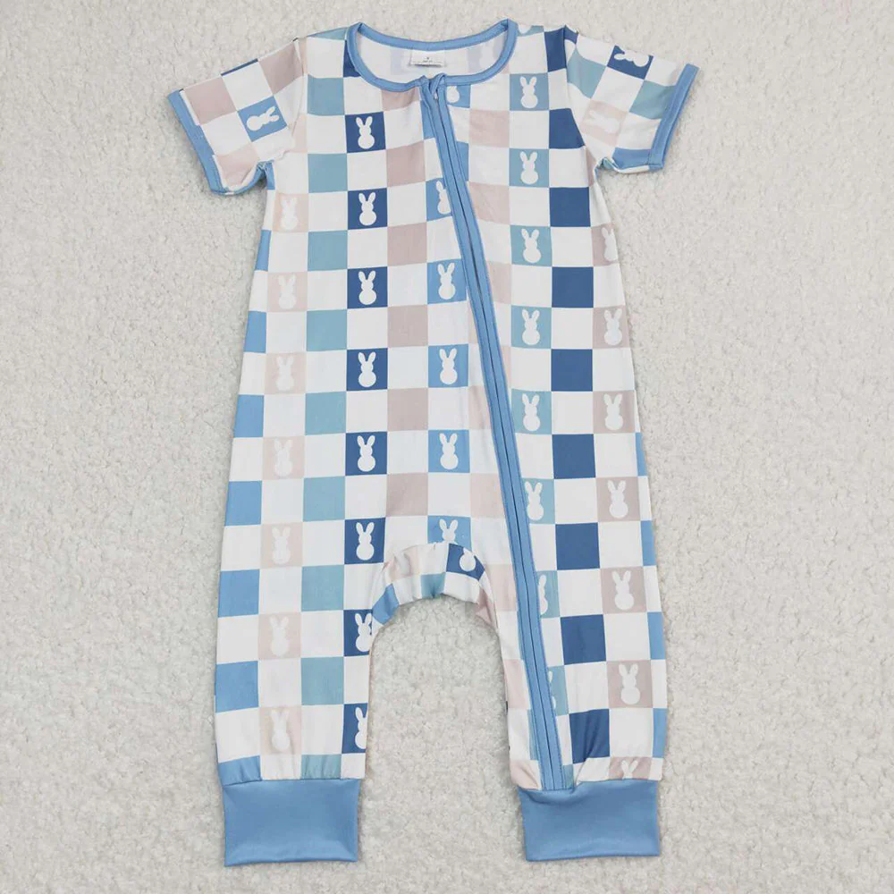 Baby Boy Kids Short Sleeves Checkered Rabbits Sibling Romper Pajamas Clothes Set