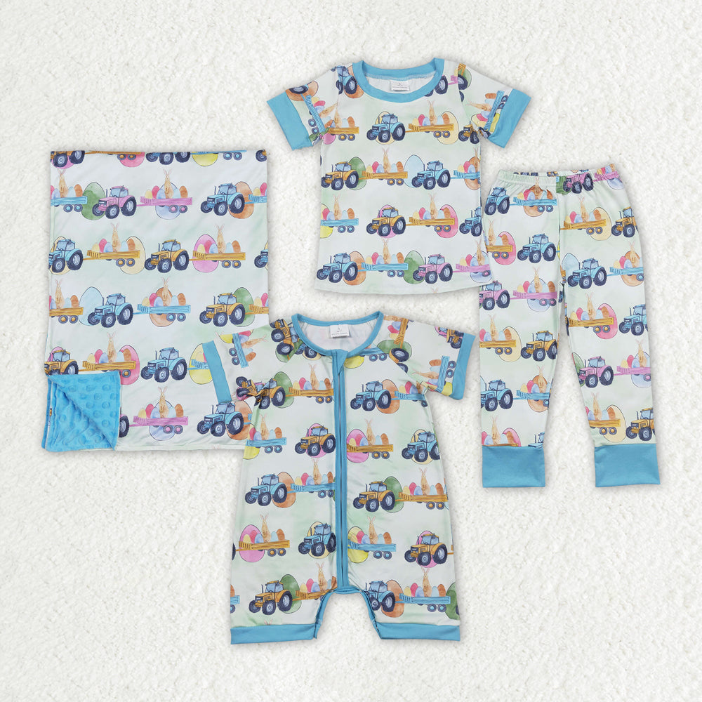 Baby Boy Kids Easter Eggs Tractors Sibling Romper Blanket Clothes Set Pajamas