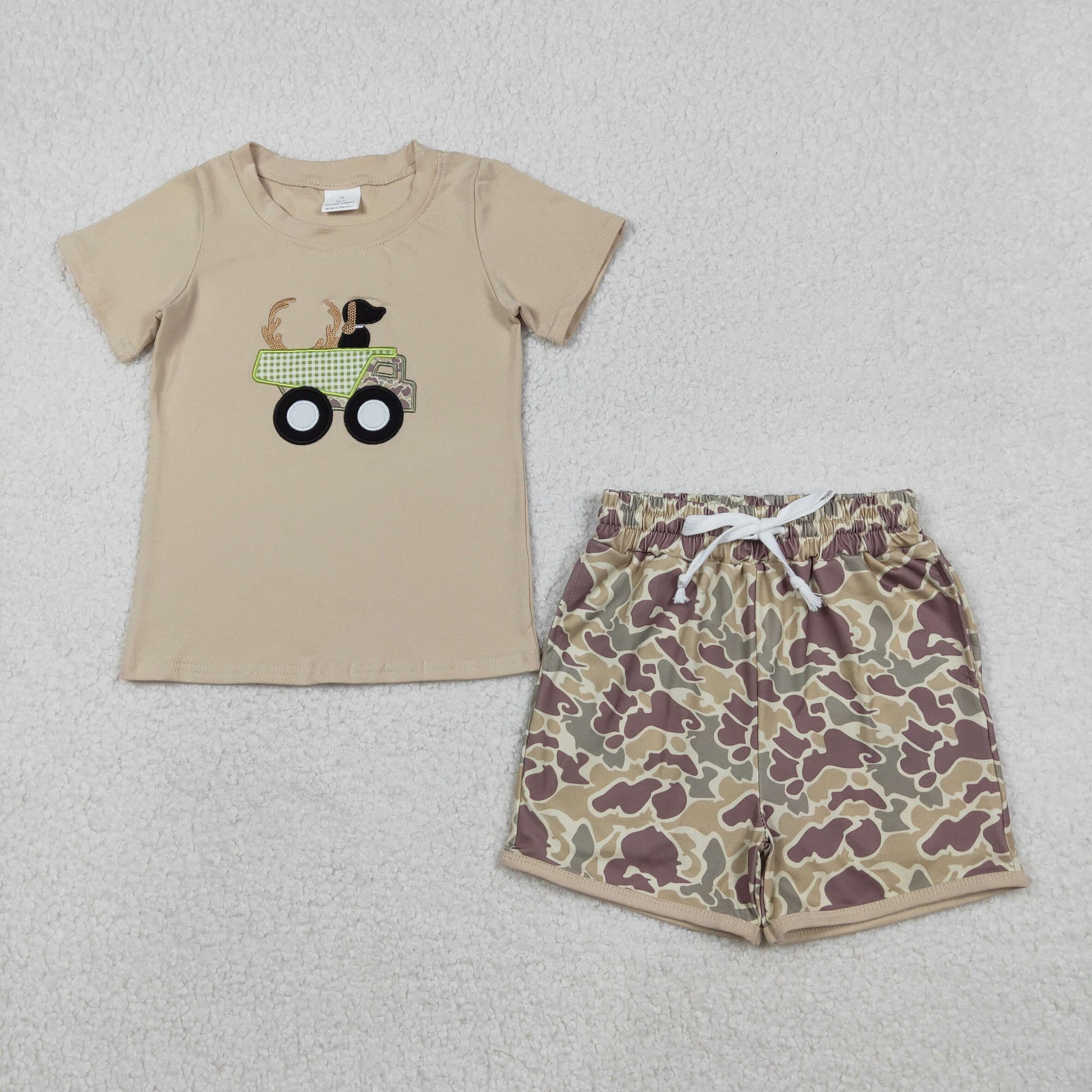Sibling Baby Boys Kids Embroidery Dogs Deer Trucks Camo Romper Hunting Sets RTS