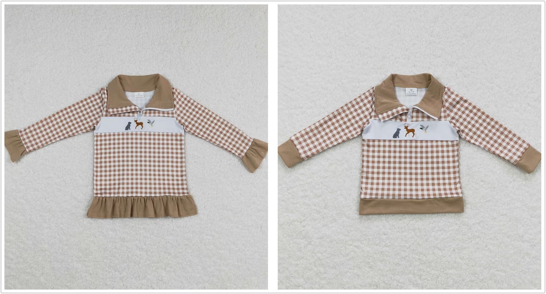 Sibling Boys Girls Long Sleeves Embroidery Dogs Ducks Deer Plaid Zipper Pullovers Tops