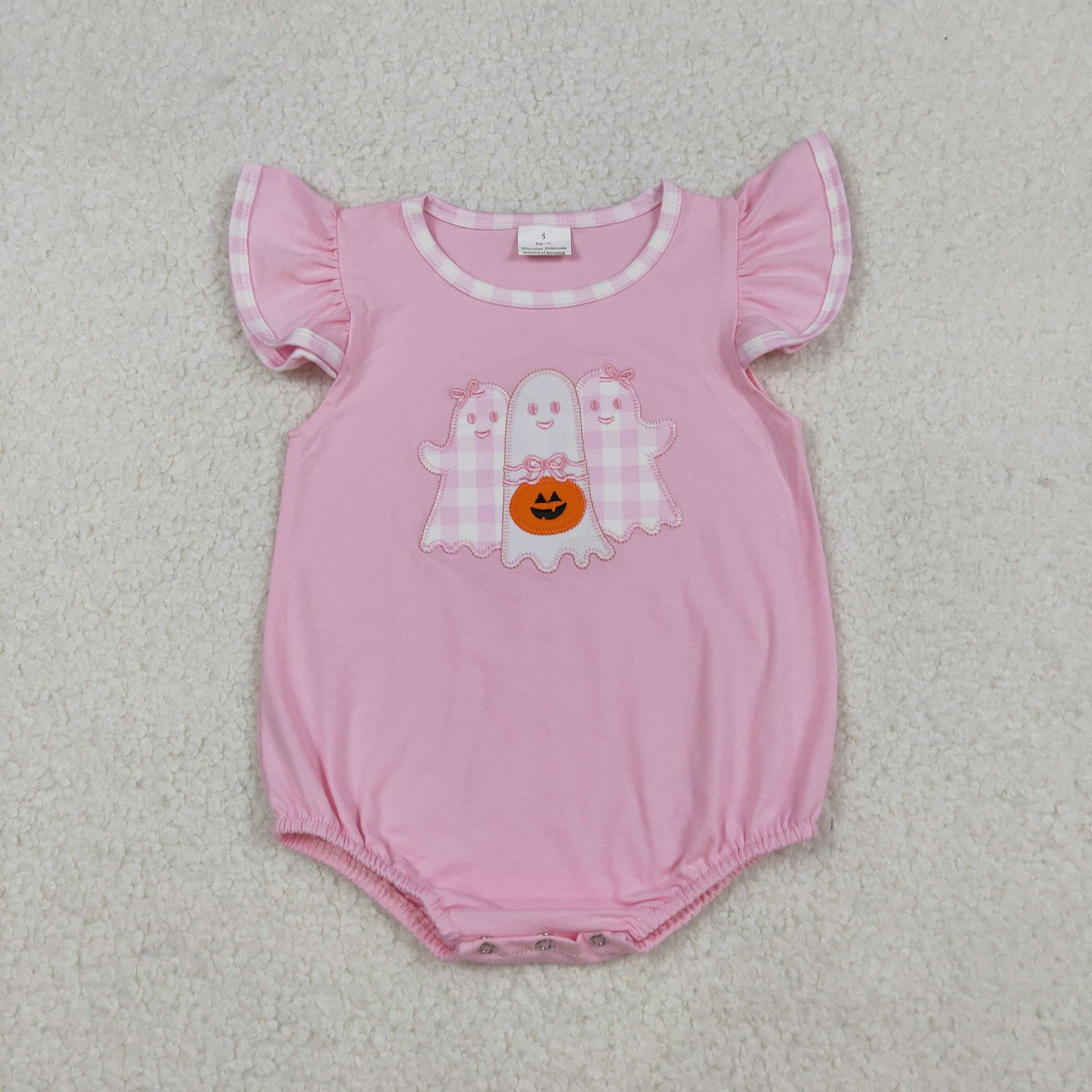 Sibling Girls Boys Short Sleeves Embroidery Ghost Pumpkin Halloween Bubble Romper RTS