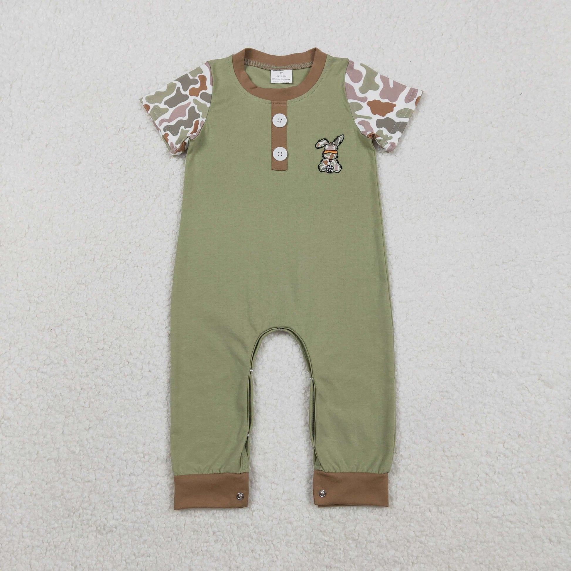 Sibling Boys Girls Camo Short Sleeves Embroidery Rabbits Easter Rompers RTS