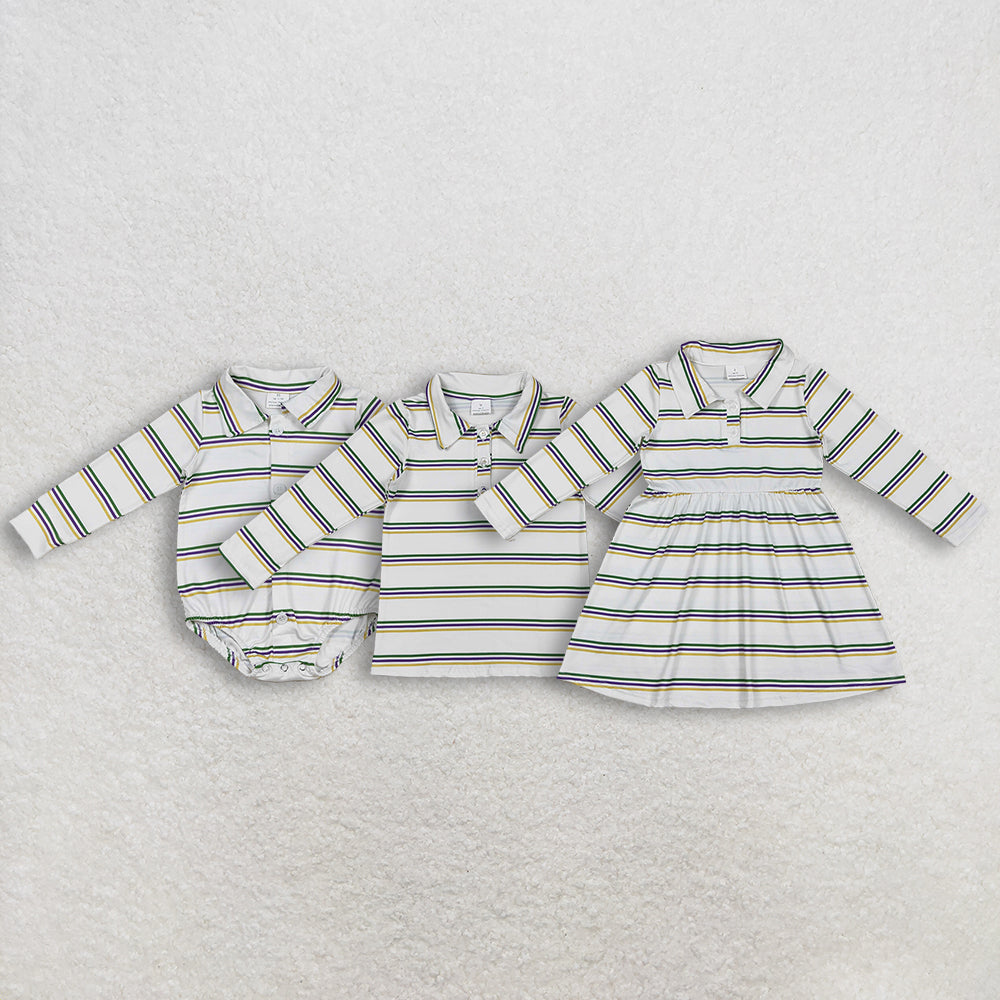 Sibling Baby Boys Girls Long Sleeves Stripes Buttons Mardi Gras Buttons Romper Shirt Dress RTS