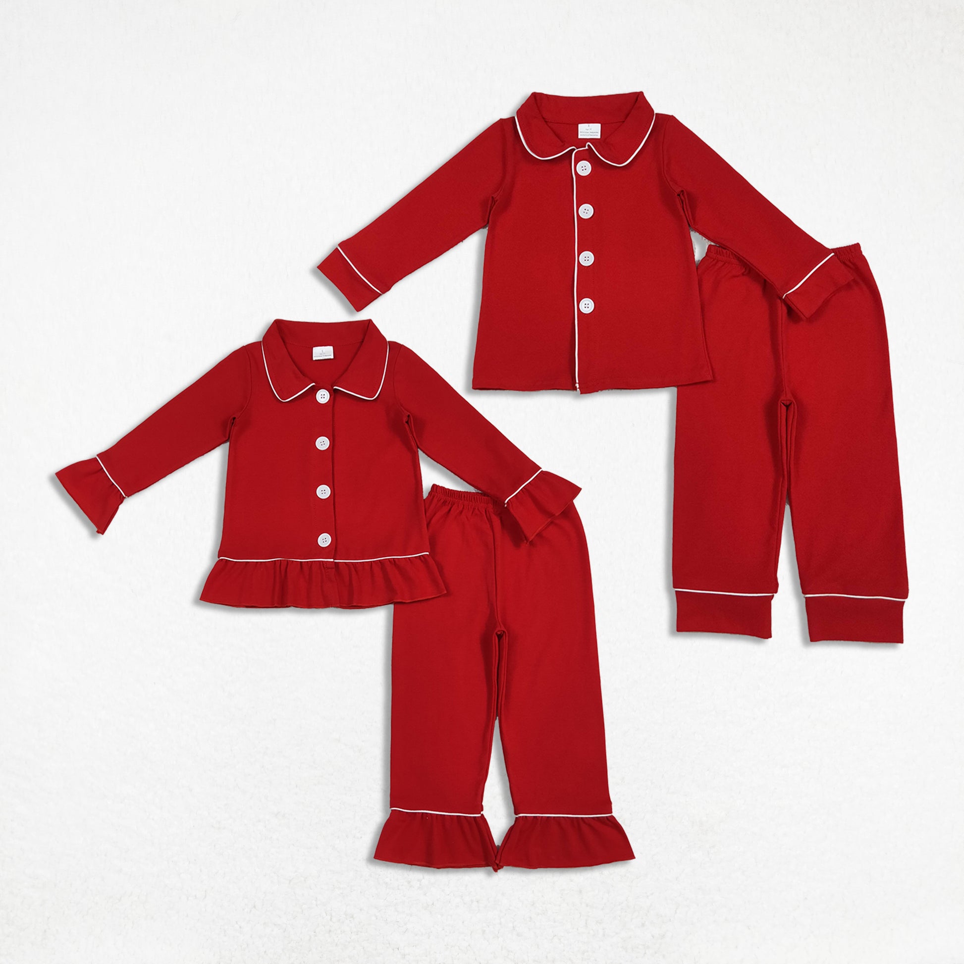 Sibling Boys Girls Long Sleeves Red Buttons Shirt Pants Christmas Cotton Pajamas Set RTS