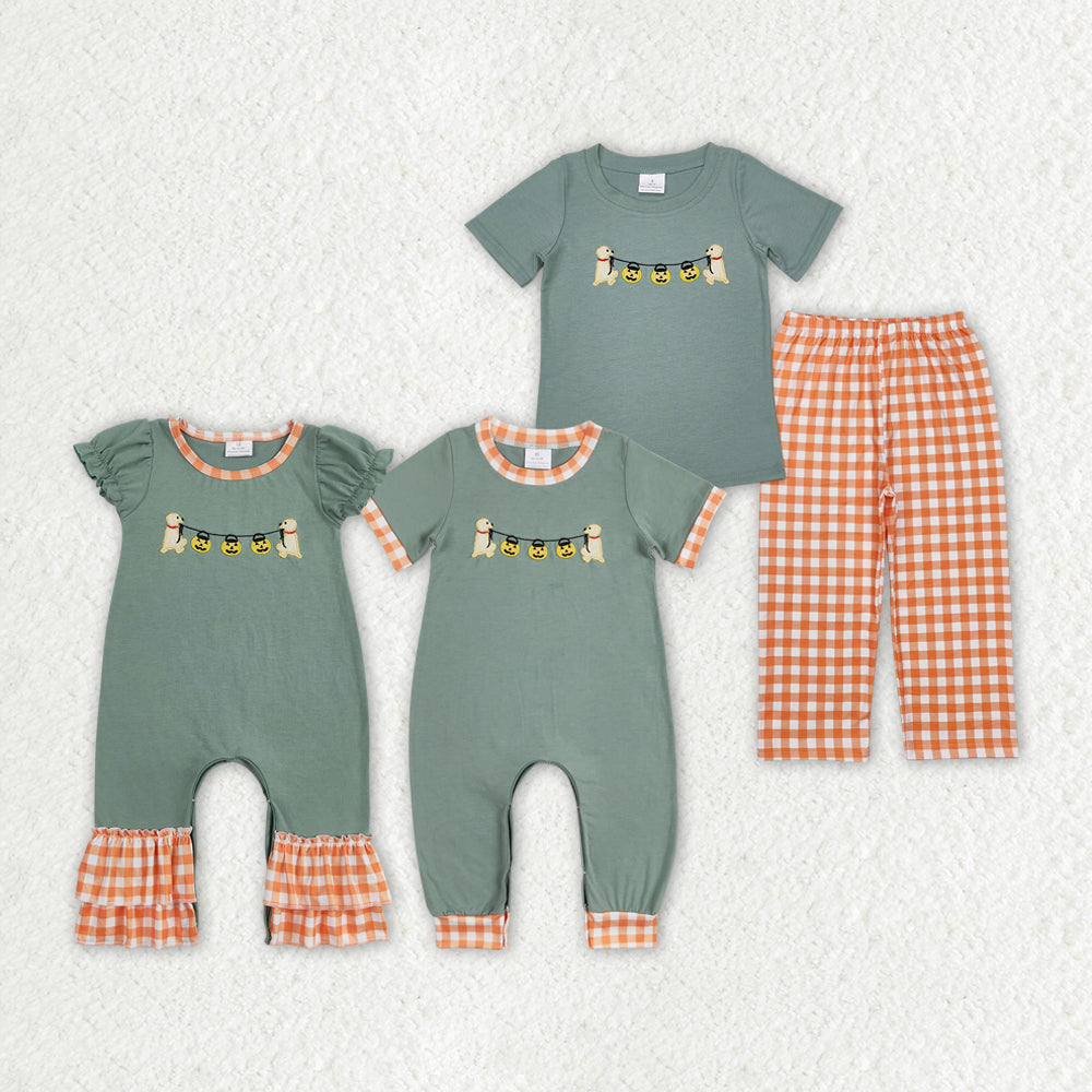 Baby Boy Girl Short Sleeves Embroidery Halloween Dogs Pumpkin Sibling Romper Clothes Set