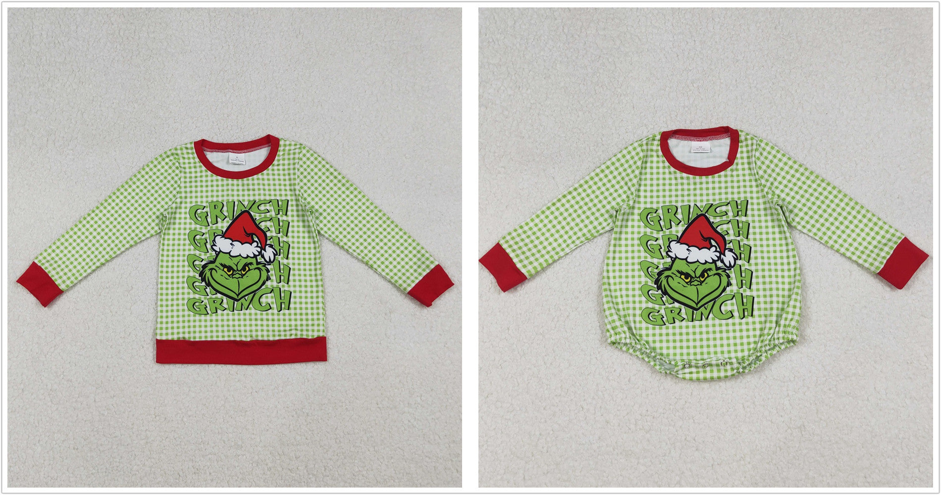 Sibling Baby Boys Long Sleeves Green Face Christmas Plaid Romper Shirt RTS