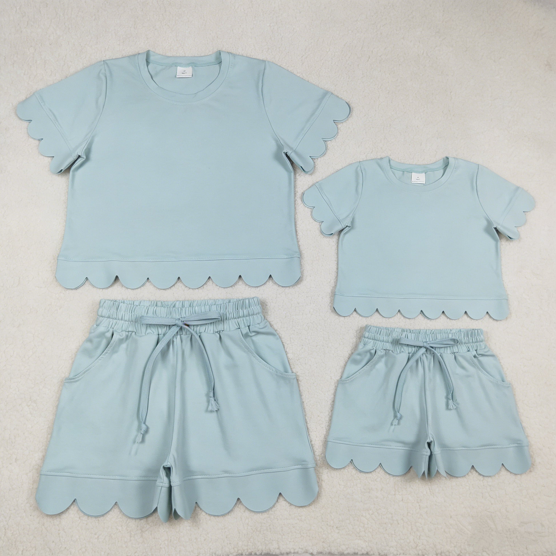 Sibling Baby Girls Adult Women Short Sleeves Blue Cotton Shirts Shorts Scallop Sets Summer Clothes RTS