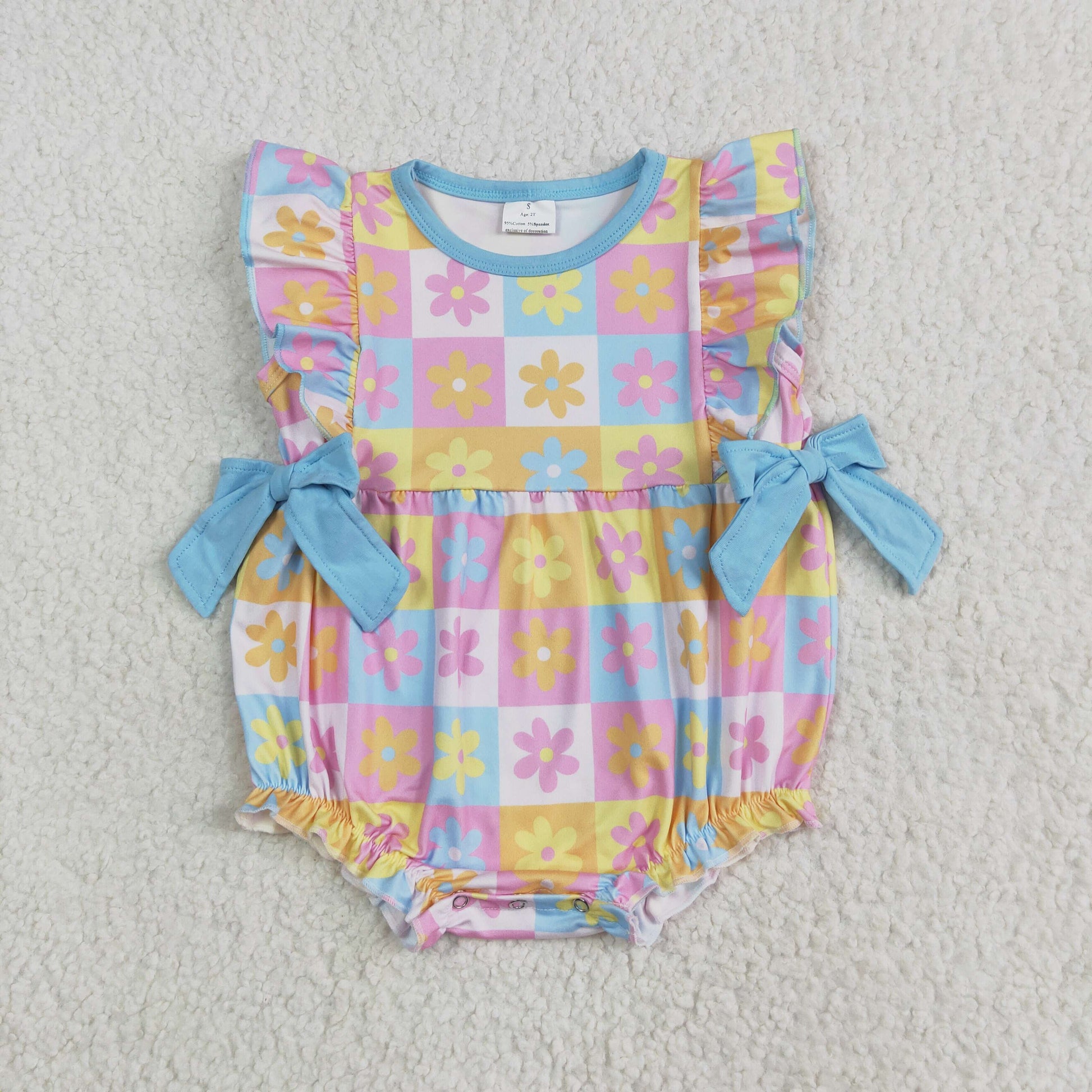 Baby Girl Short Sleeves Flower Plaid Blue Bows Sibling Romper Set RTS