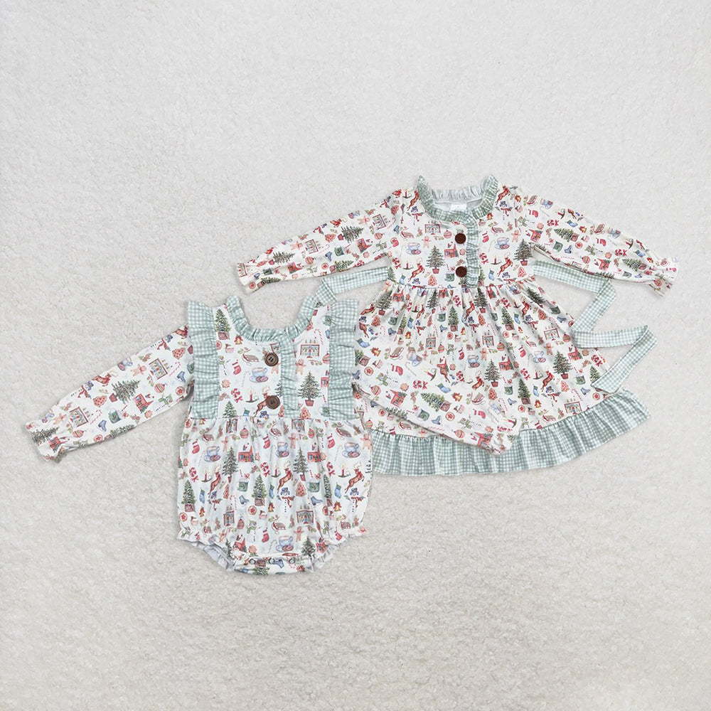 Sibling Girls Kids Long Sleeves Christmas Bubble Romper Knee Length Dress Clothes RTS