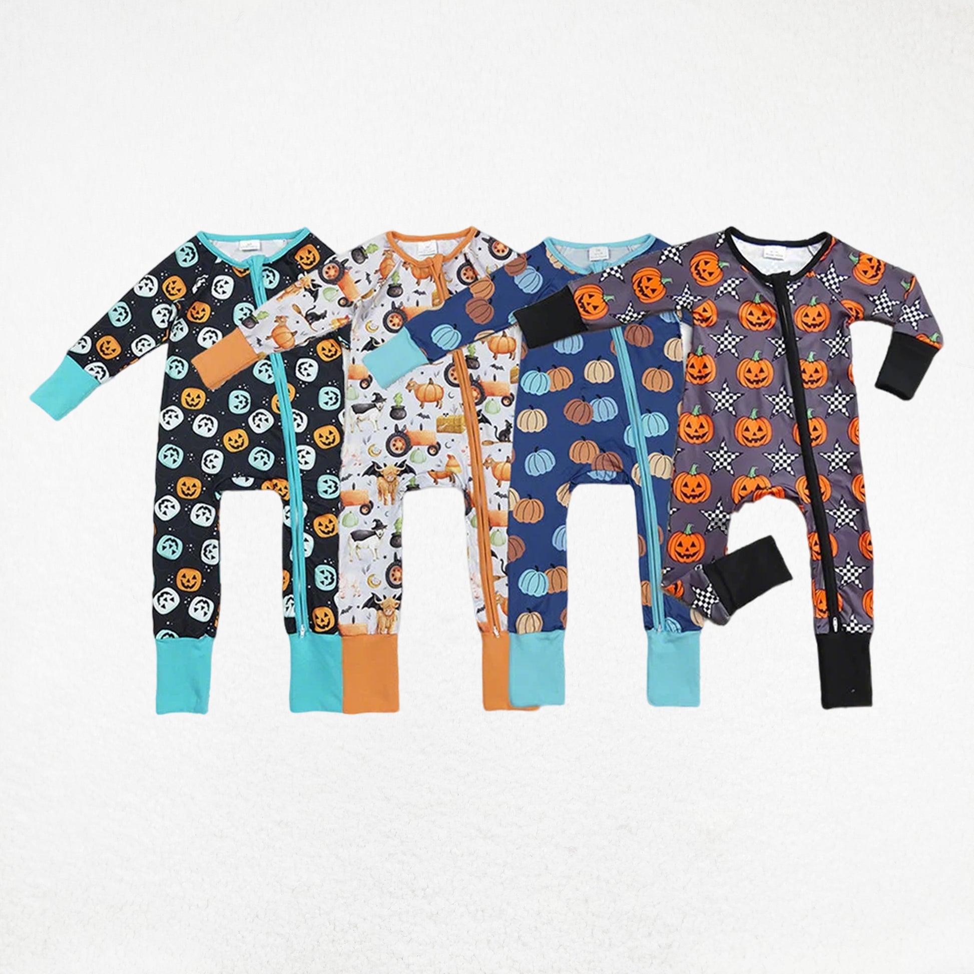 Sibling Baby Girls Colorful Ghost Pumpkins Fall Halloween Zipper Footie Rompers