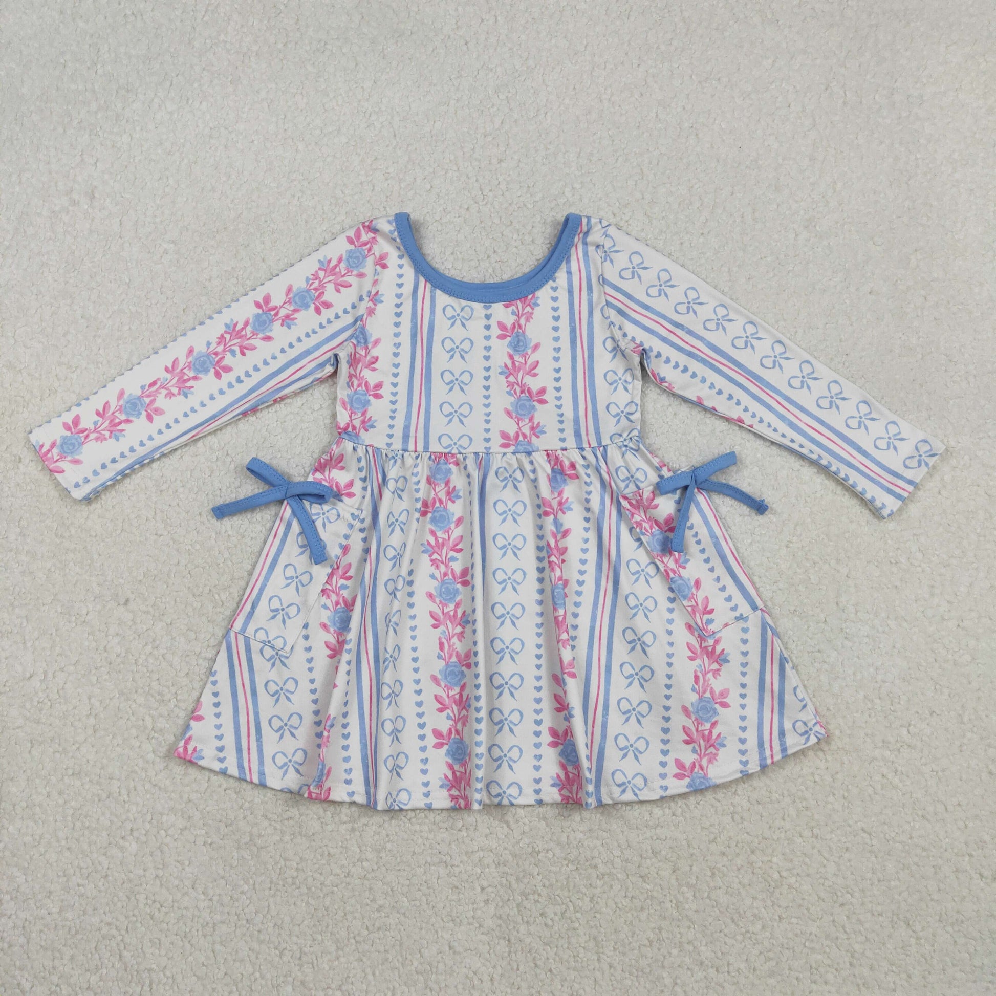 Sibling Baby Girls Long Sleeves Hearts Flower Bows Pockets Valentine Knee Length Dresses RTS