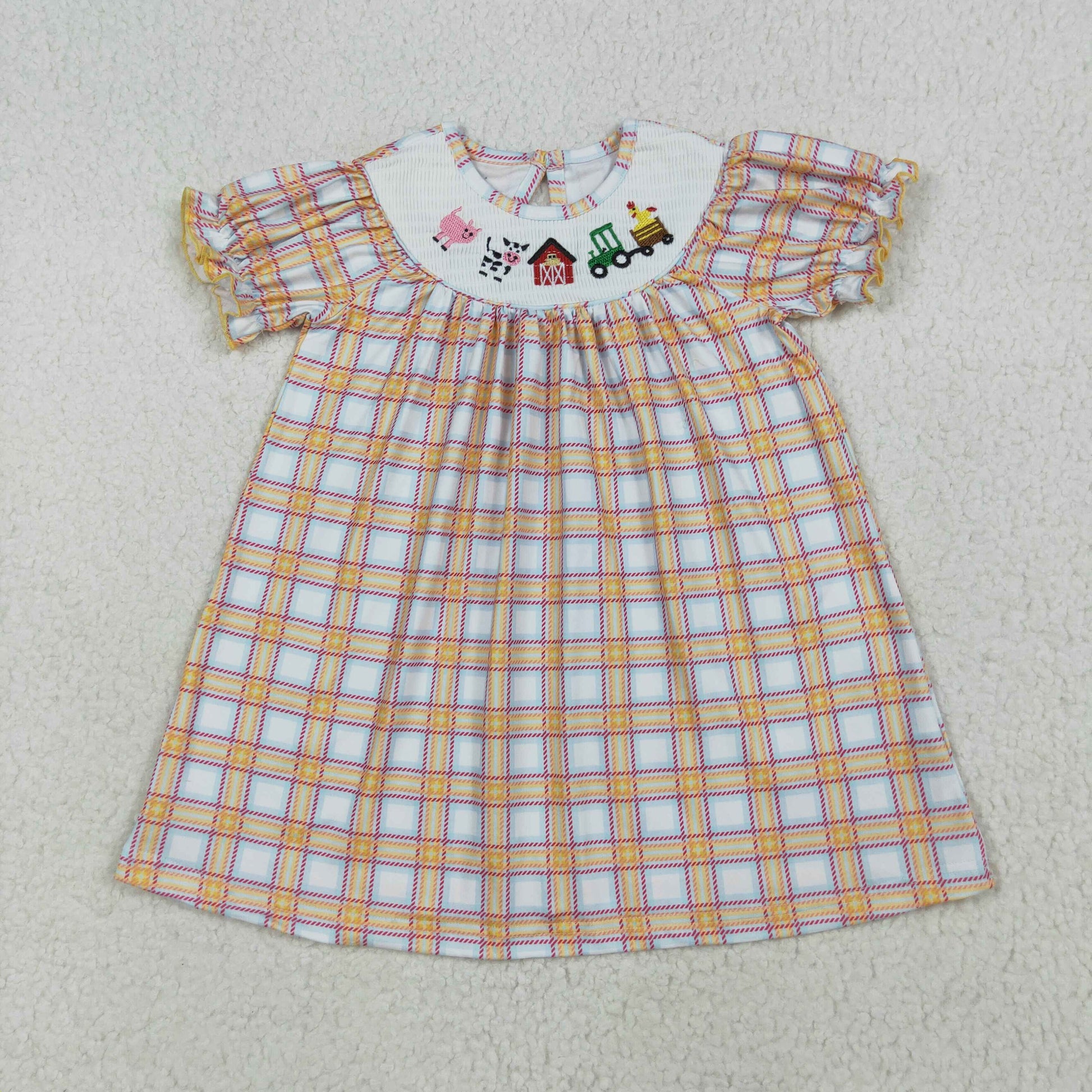 Baby Girl Short Sleeves Embroidery Farm Animals Plaid Sibling Smocked Romper Dress RTS