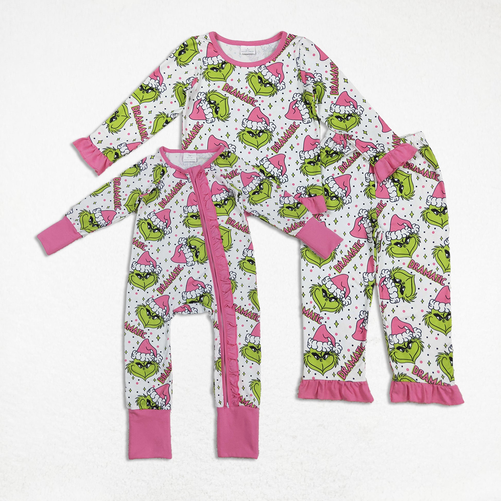 Girls Kids Green Face Pink Ruffle Zipper Footie Romper Pajamas Set Sibling Christmas Clothes RTS