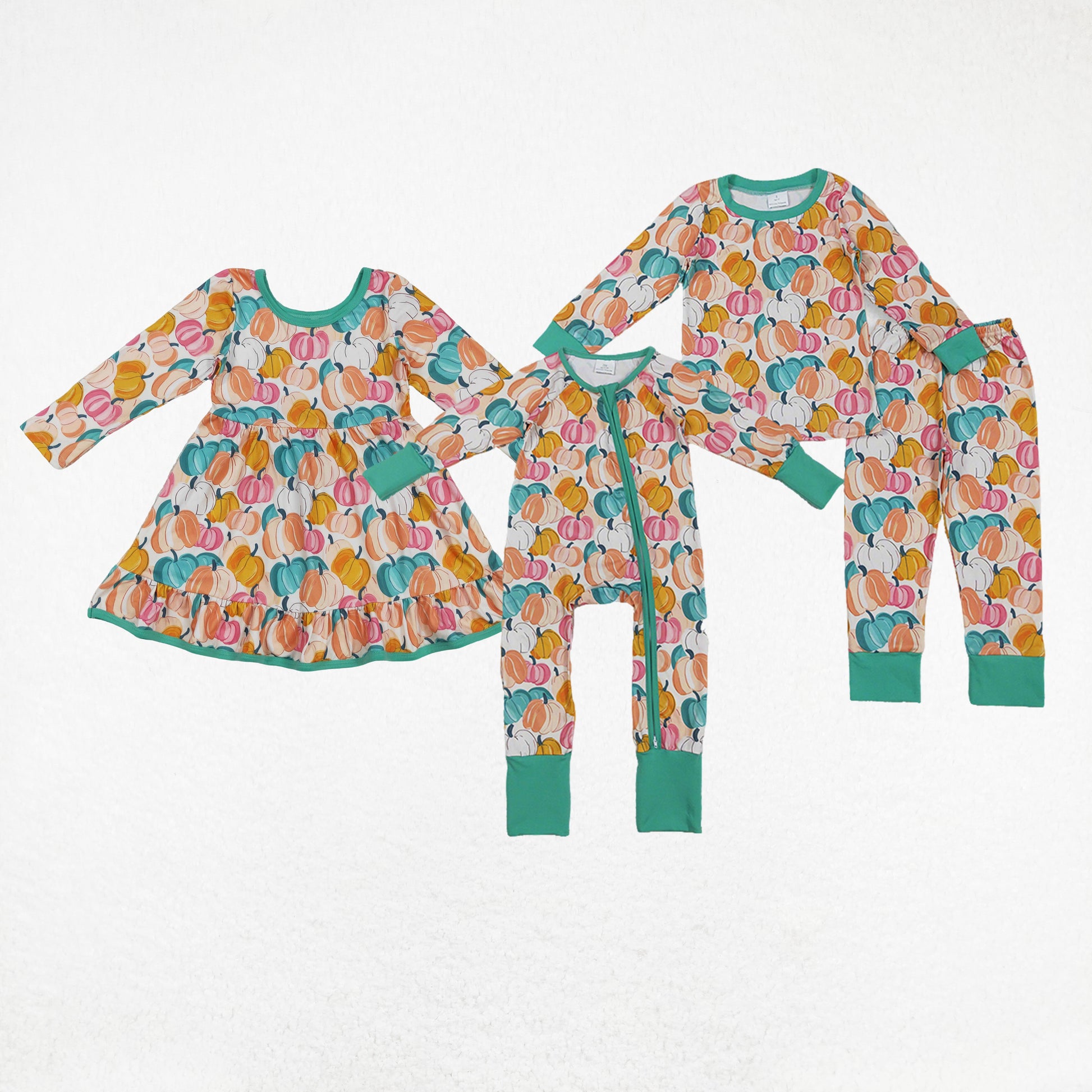 Sibling Girls Kids Long Sleeves Pumpkins Fall Zipper Footie Romper Dress Pajamas Set RTS