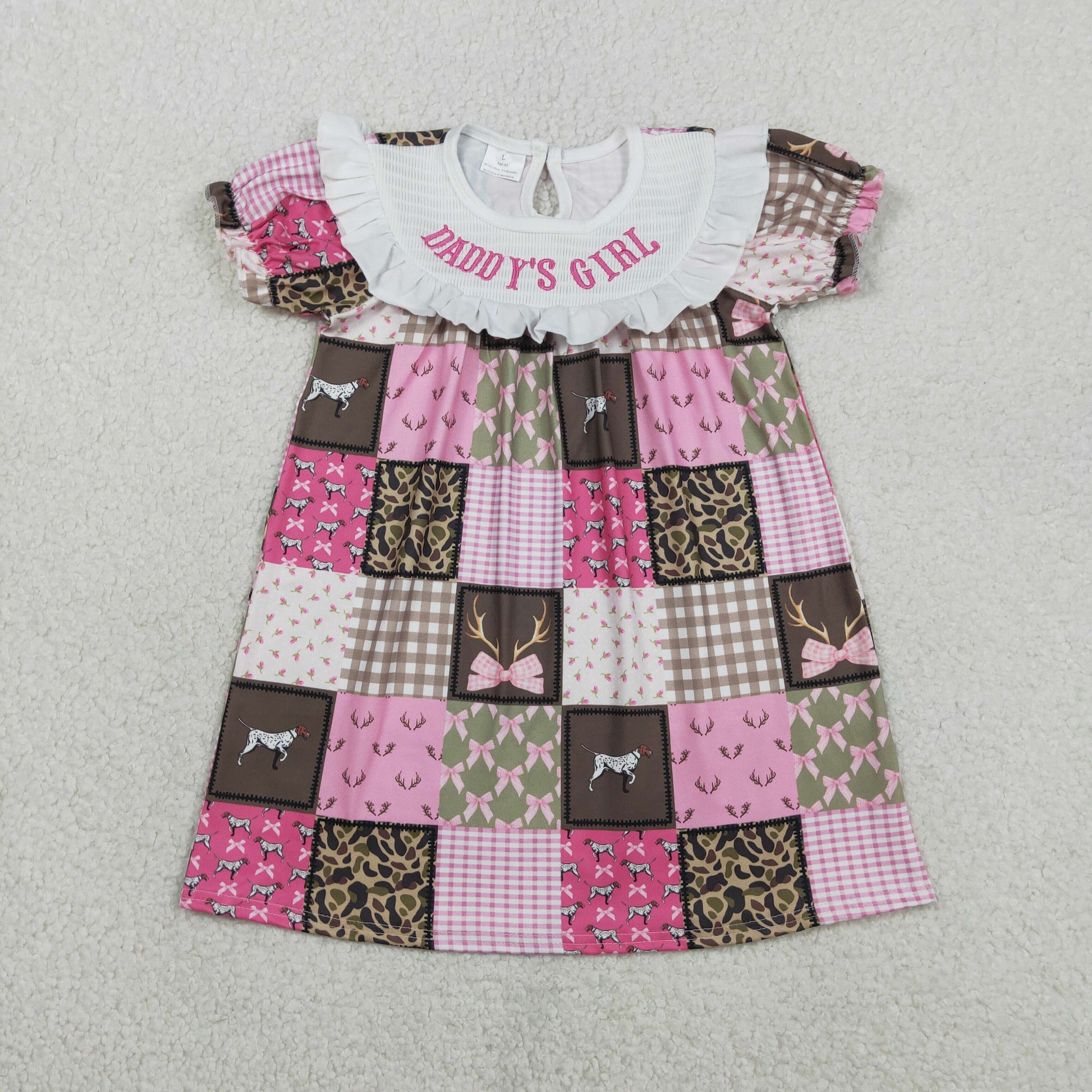 Sibling Baby Girls Short Sleeves Embroidery Smocked Daddy's Girl Bows Dogs Deer Camo Romper Dress RTS