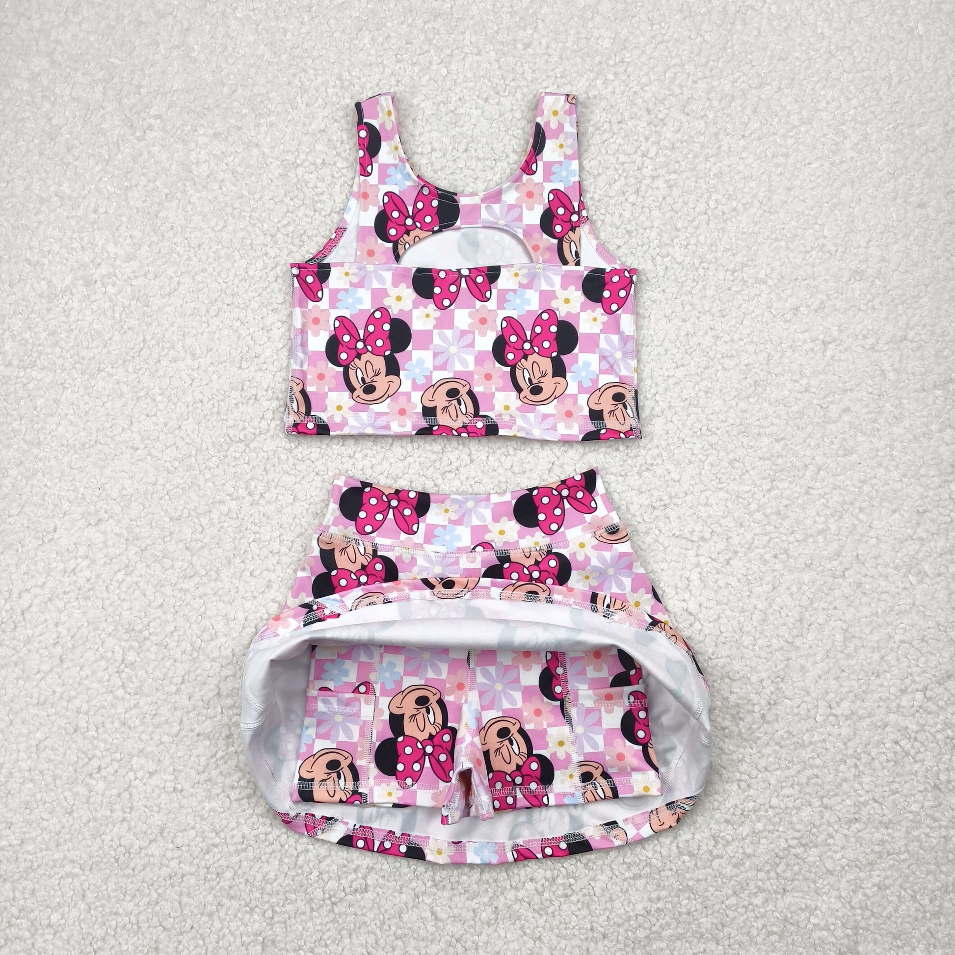 Baby Girl Sleeveless Mouse Flower Checked Skorts Sibling Yoga Active Set Dress RTS