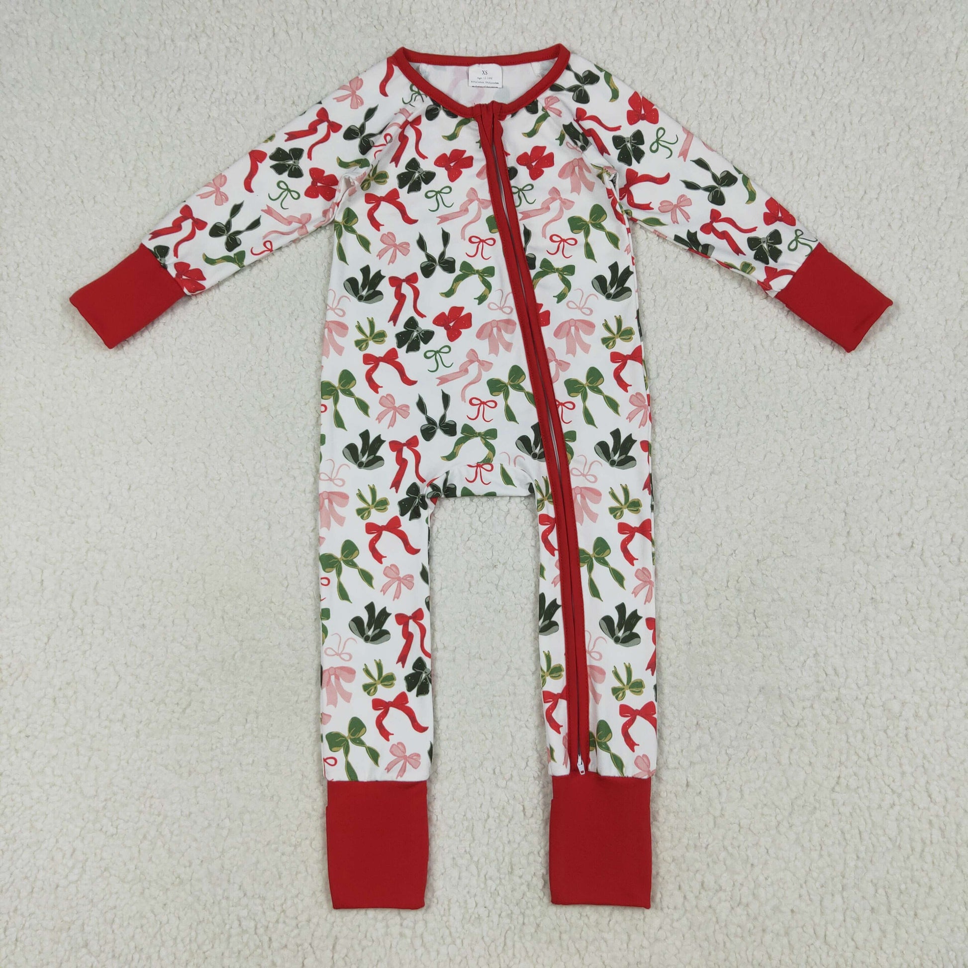 Sibling Baby Boys Girls Kids Christmas Bows Santa Two-way Zipper Footie Sleeper Rompers RTS