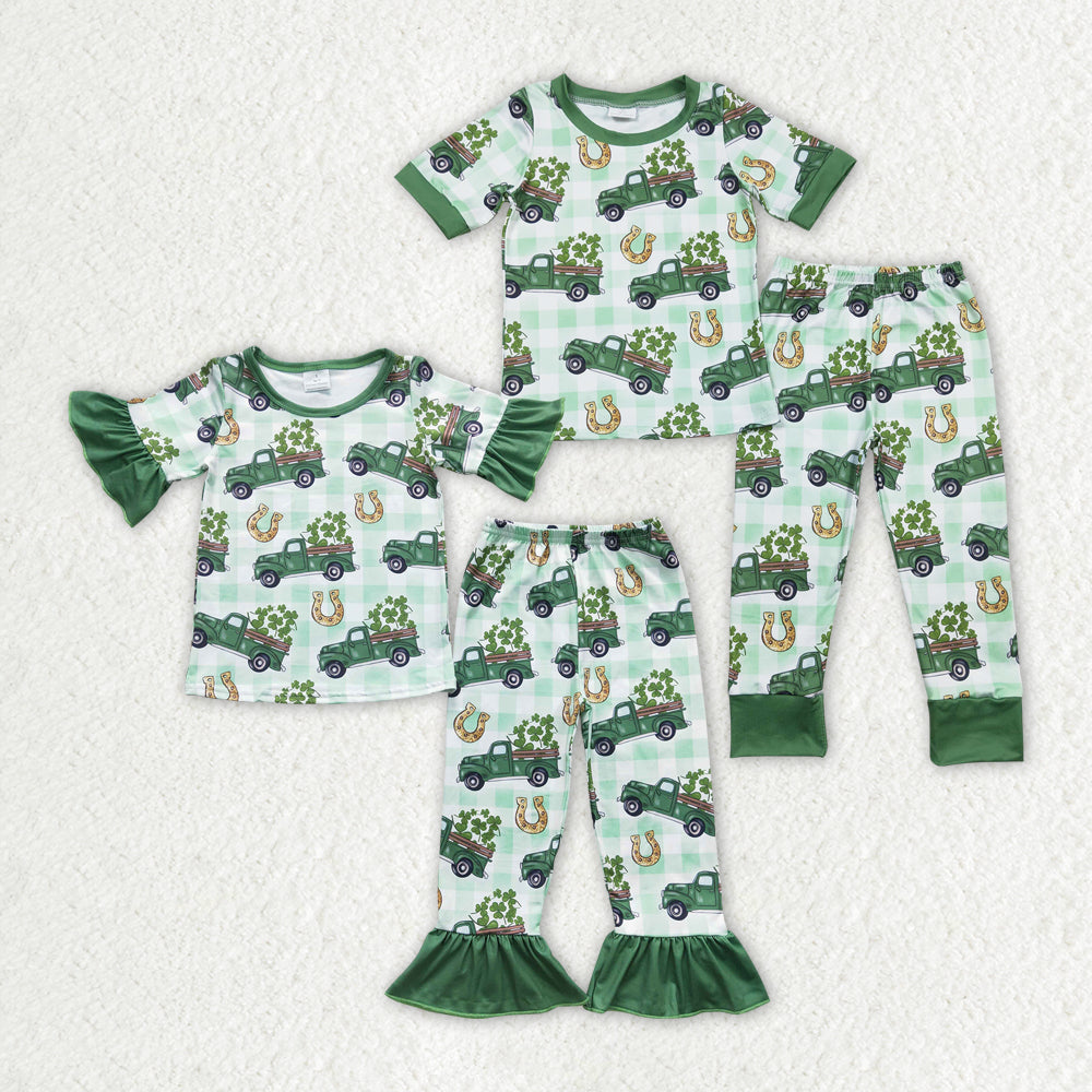 Baby Boy Girl Short Sleeves Car Green Pants St Patrick Day Sibling Pajamas Set