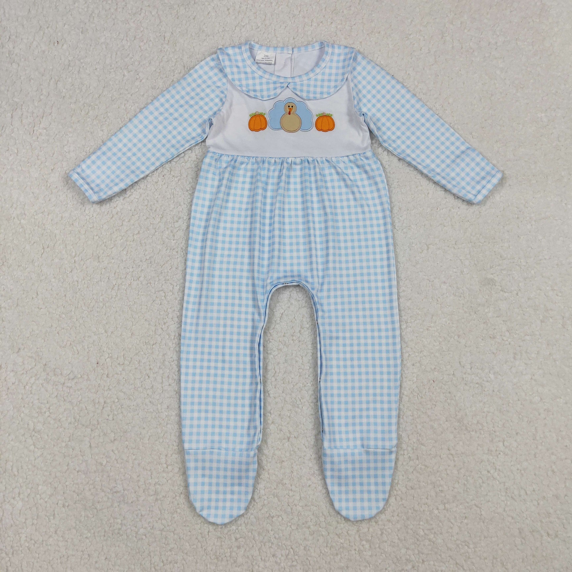 Sibling Boys Girls Infant Fall Embroidery turkey Pumpkins Thanksgiving Footies Romper RTS