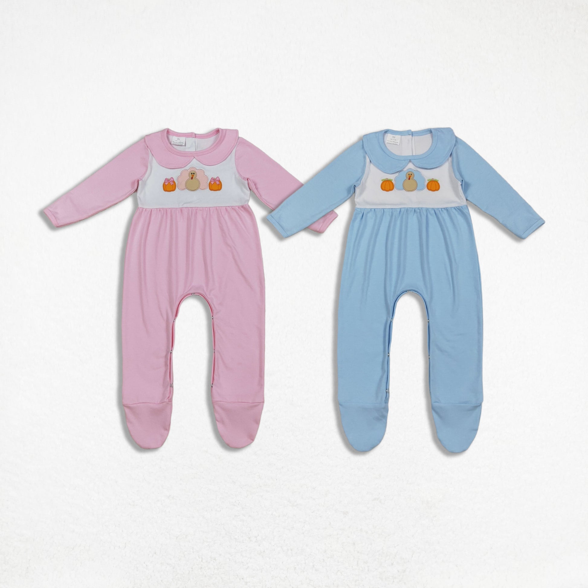 Sibling Boys Girls Infant Long Sleeves Embroidery turkey Pumpkins Thanksgiving Footies Romper RTS