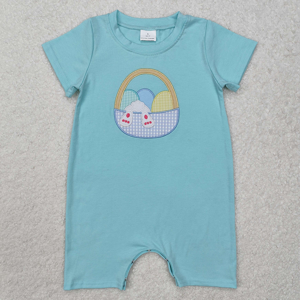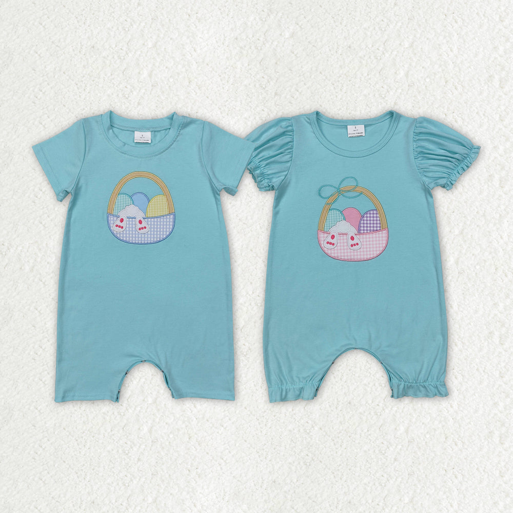 Baby Boy Girl Infant Short Sleeves Embroidery Easter Eggs Basket Sibling Romper