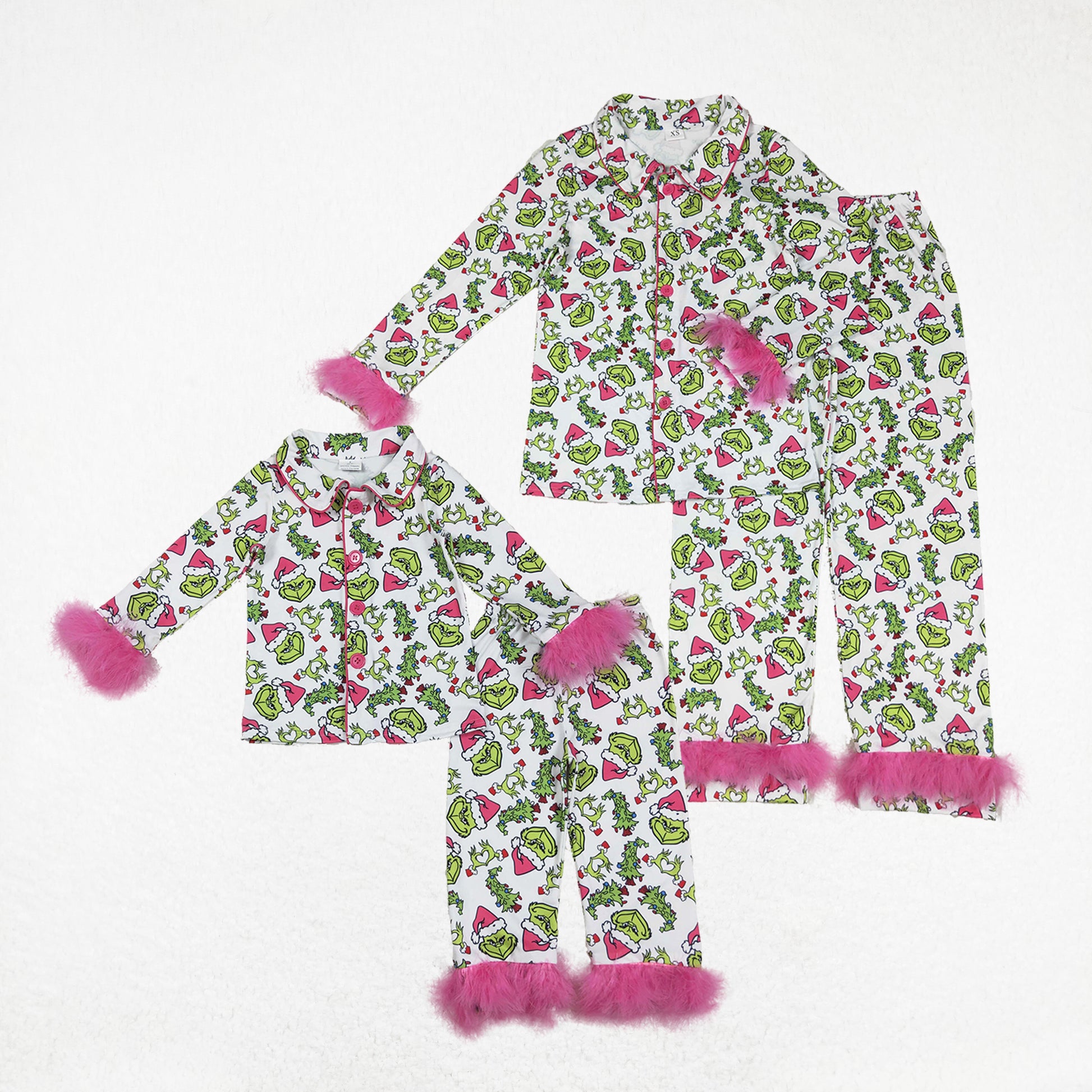 Sibling Girls Kids Adult Women Green Face Buttons Fur Shirt Pants Mom and Me Christmas Pajamas Set RTS