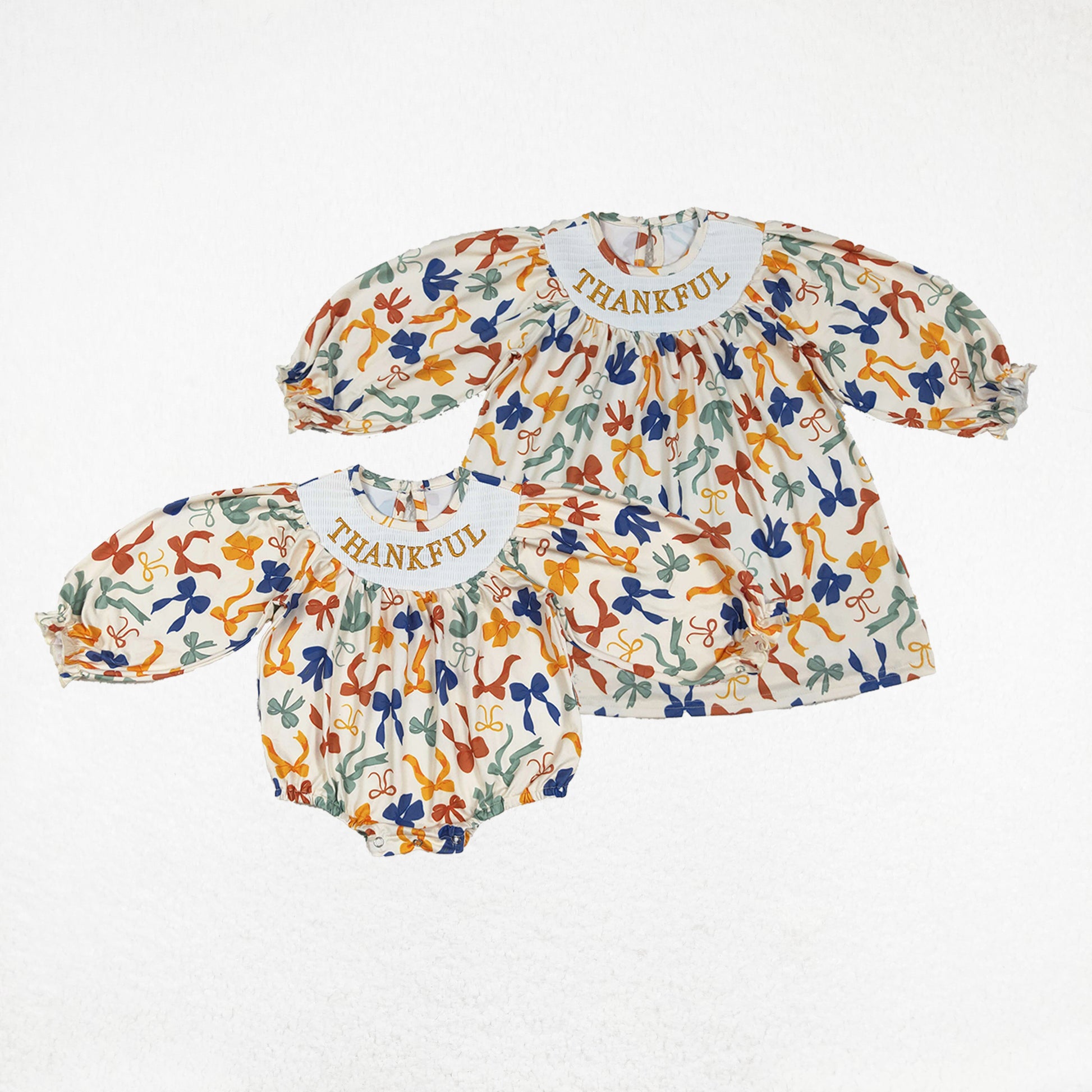 Baby Girl Long Sleeves Embroidery Thankful Colorful Bows Sibling Smocked Fall Romper Dress RTS