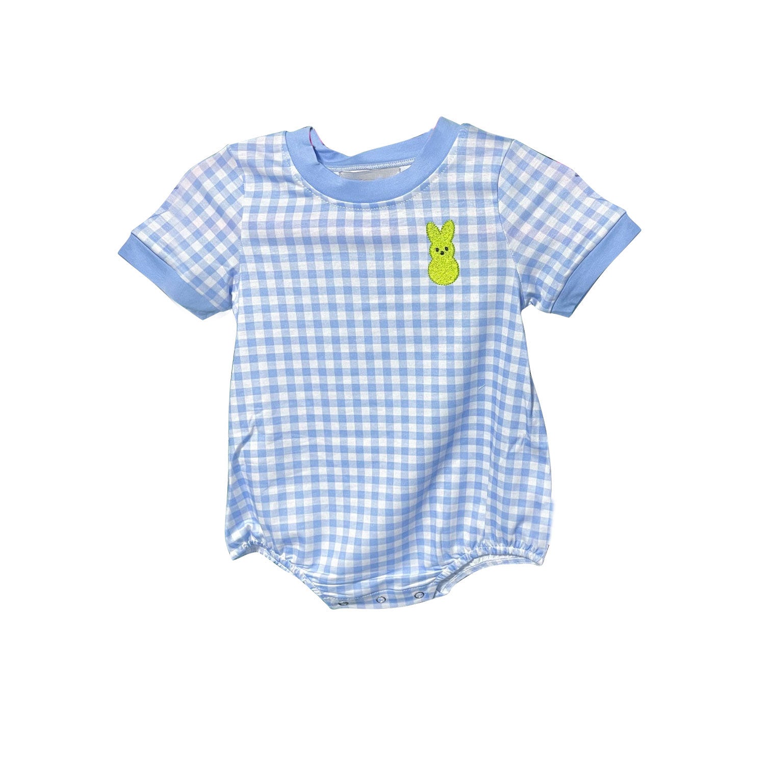 ( Moq 5 ) Preorder Boys Kids Short Sleeves Blue Plaid Rabbit Easter Bubble Romper